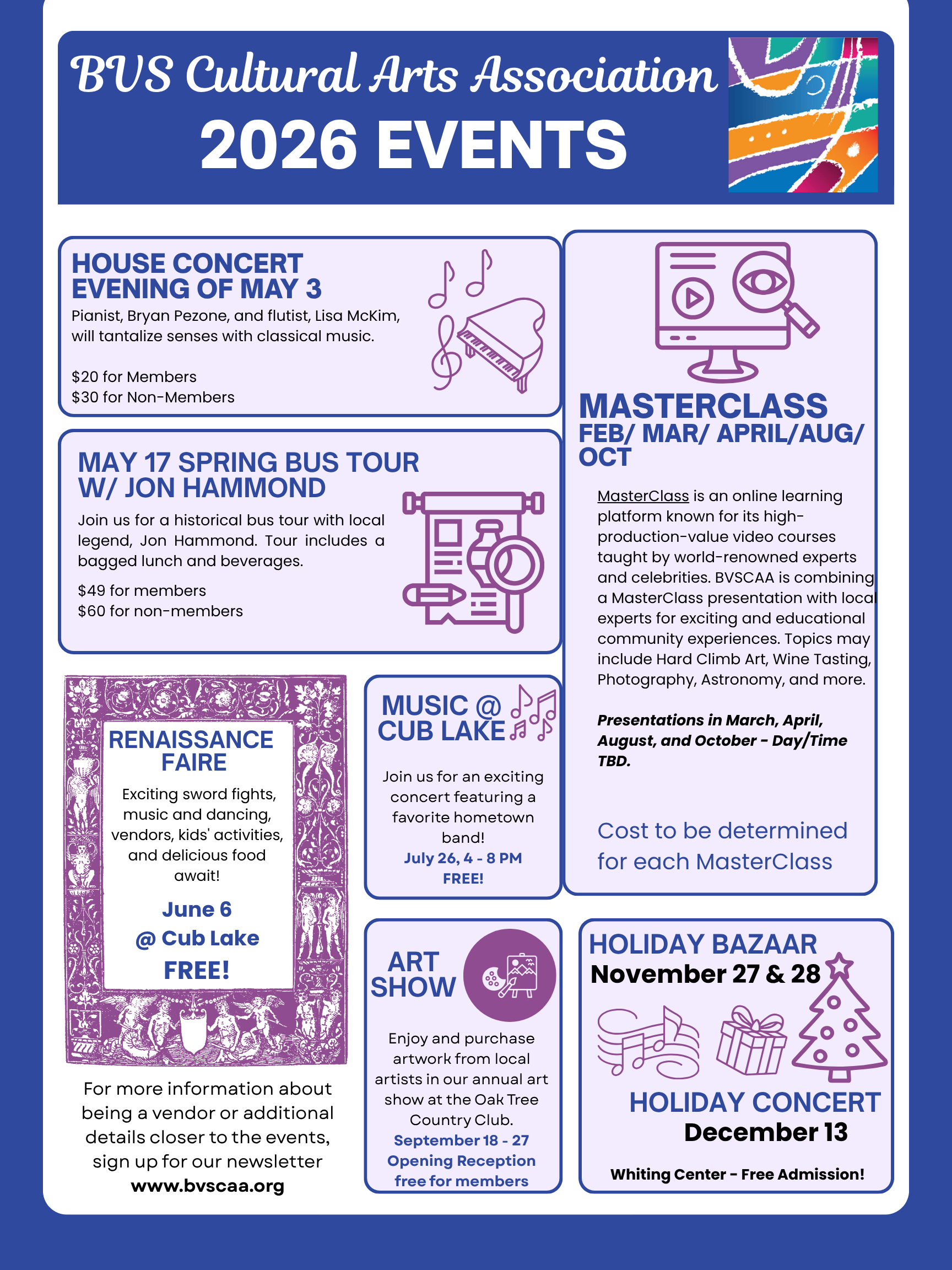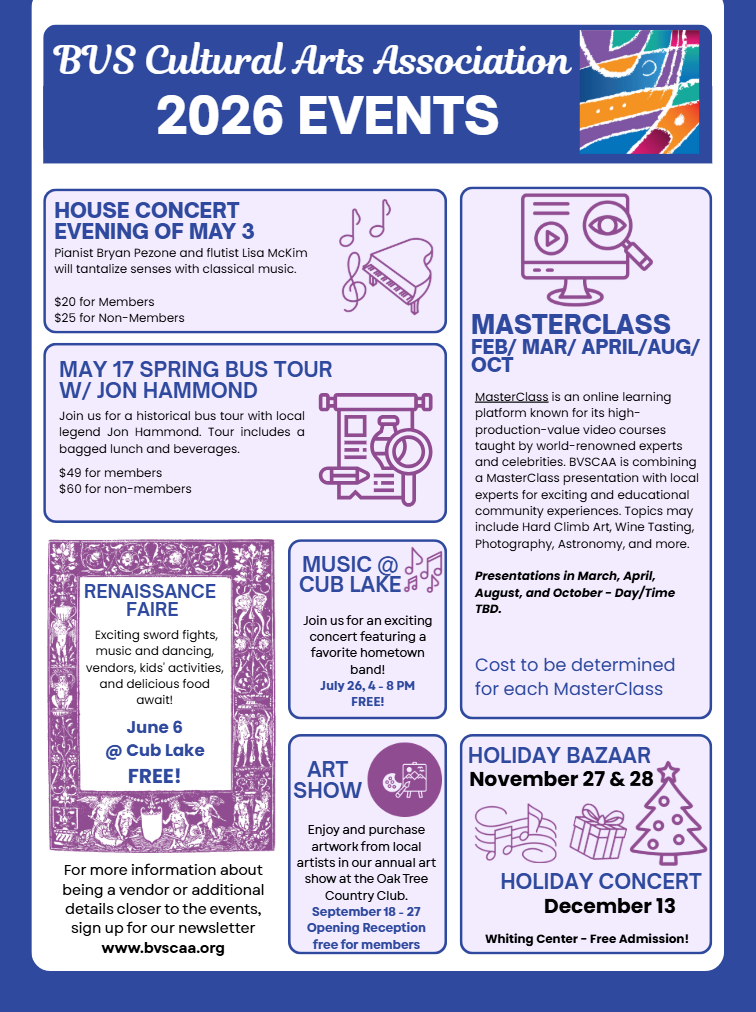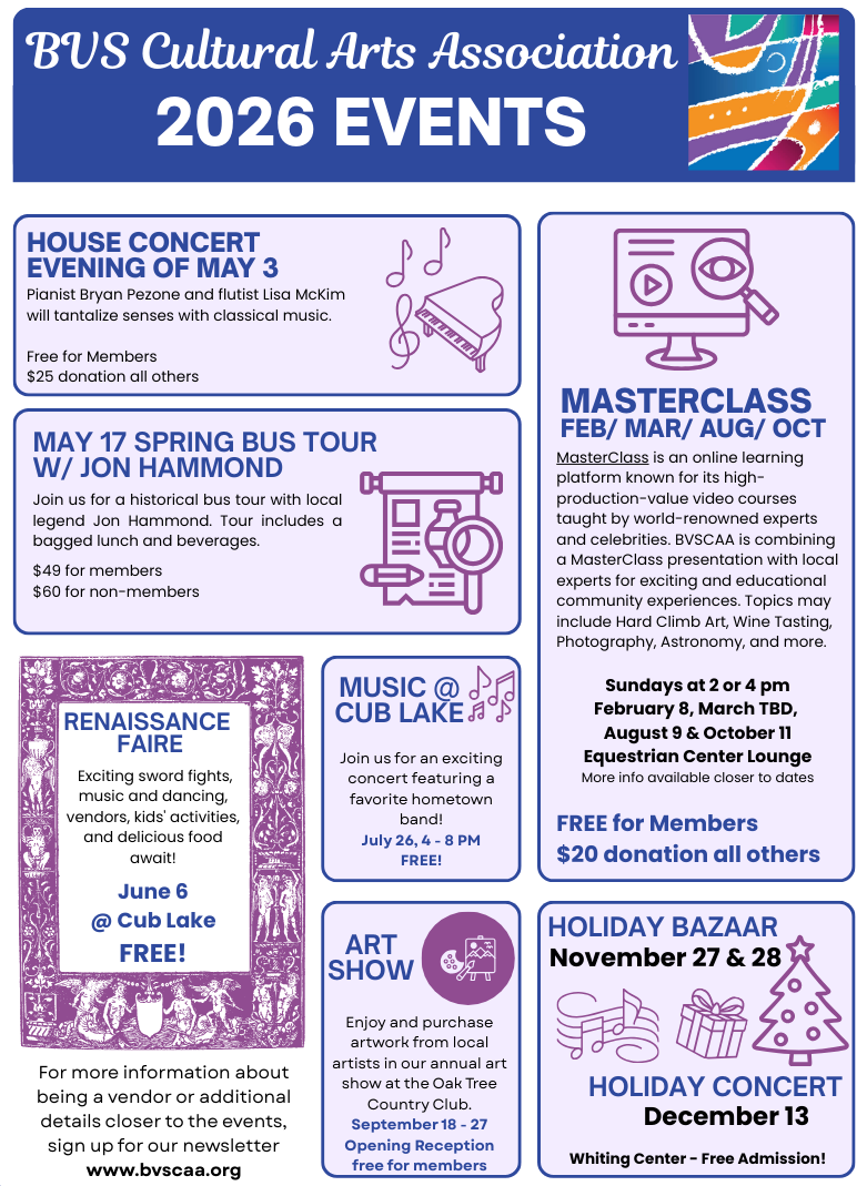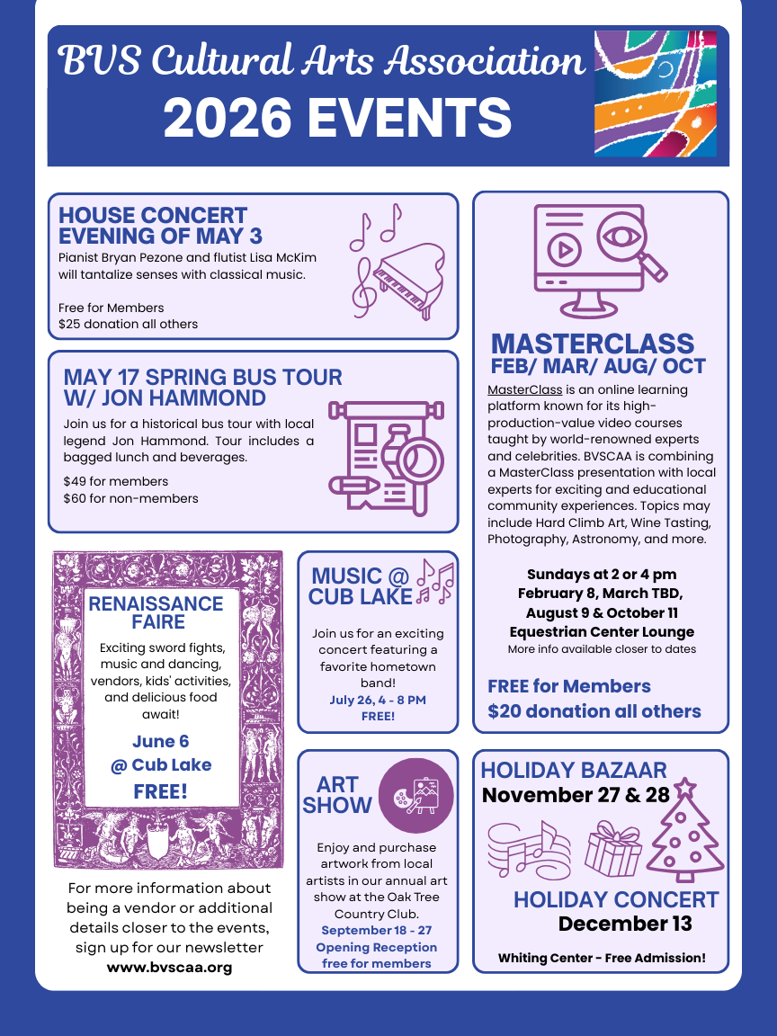 The BVS Cultural Arts Association is a 501 (c) (3) non-profit organization Tax ID # 77-0005094, dedicated to enriching the cultural life of Bear Valley Springs and the greater Tehachapi area. We sponsor concerts, art shows, a holiday bazaar, scholarships, and cultural events to enrich the life of our community.