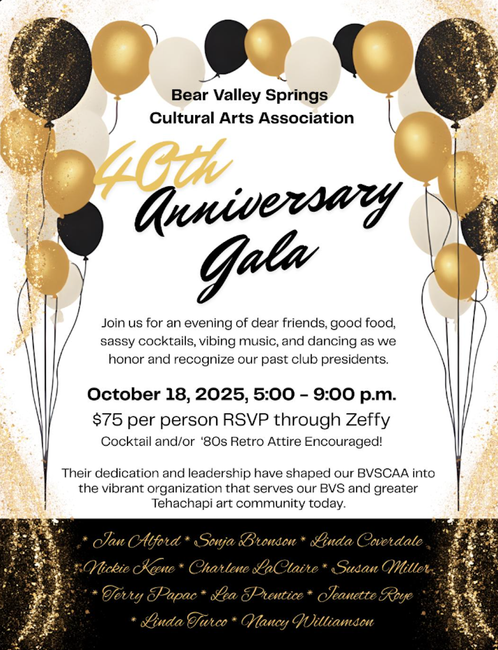 This celebration at Oak Tree County Club is a celebration of 40 years serving the community. This event will include dinner, no host bar, entertainment, dancing, and auction to benefit local arts and culture opportunities for our community including supporting Tehachapi Arts, Symphony, Theatre and High School scholarships. The night will also include the Honoree Award. Festive dress suggested. Tickets are available now.