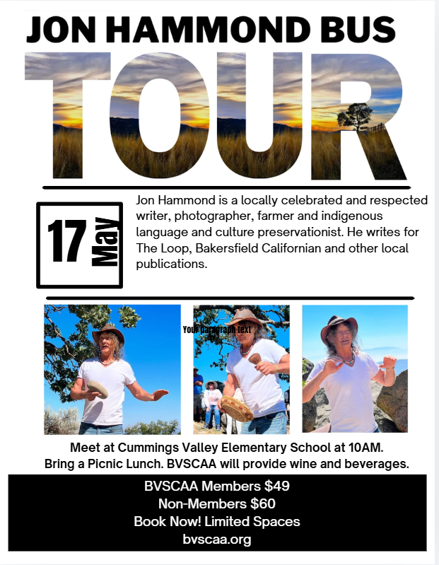 A chartered bus will take us around the Tehachapi area. Jon Hammond will provide the narrative with his interesting perspective of our community history. Bring your own picnic lunch. We will provide the beverages. Meet at the Cummings Valley Elementary School to begin the tour.